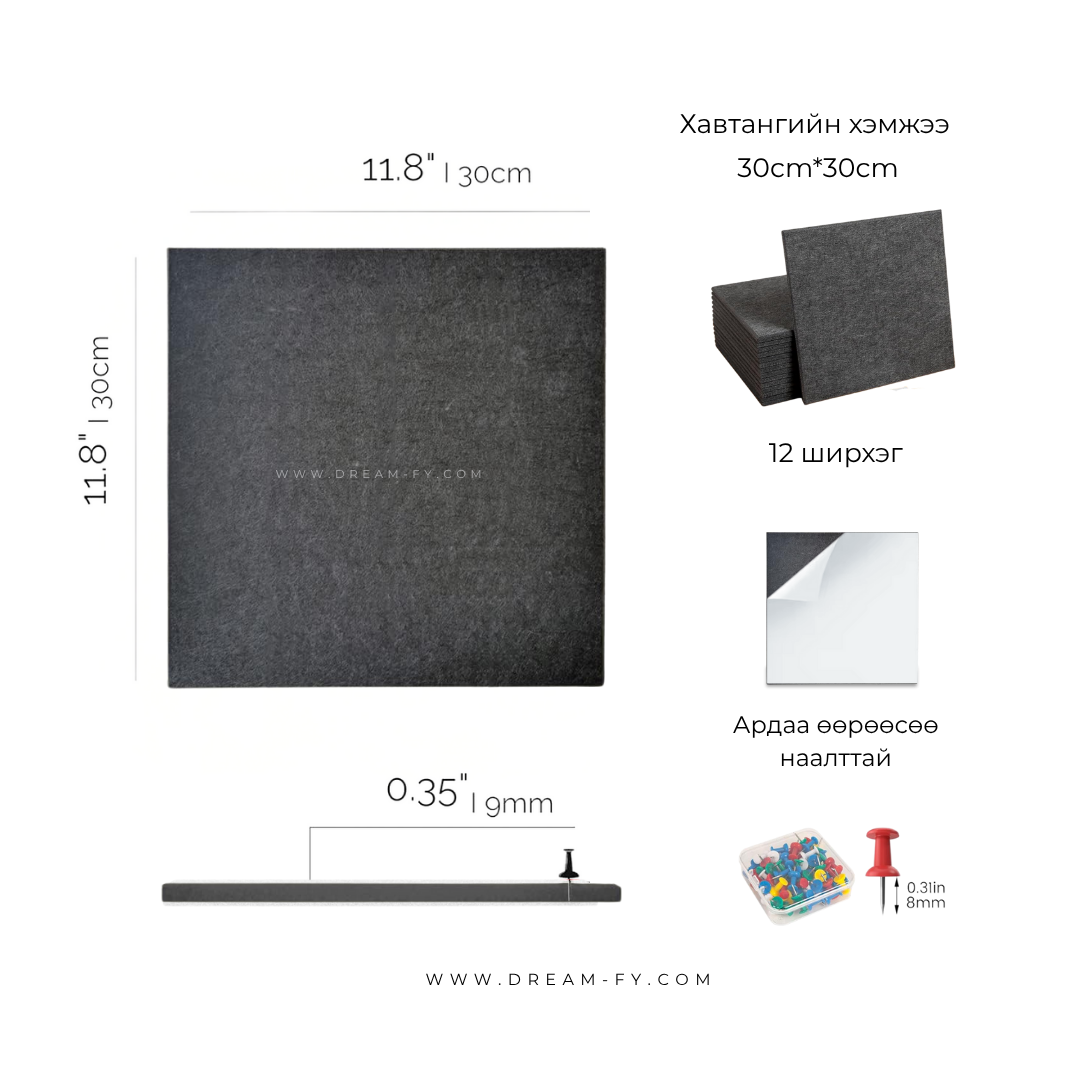 - 12 ширхэг өндөр нягтрал бүхий чанартай шахмал, нанотехнологи дээр тулгуурласан арчиж цэвэрлэх боломжтой эсгийнцэр хавтан (ардаа цавуу наалттай тул, шууд хуулаад наахад бэлэн)