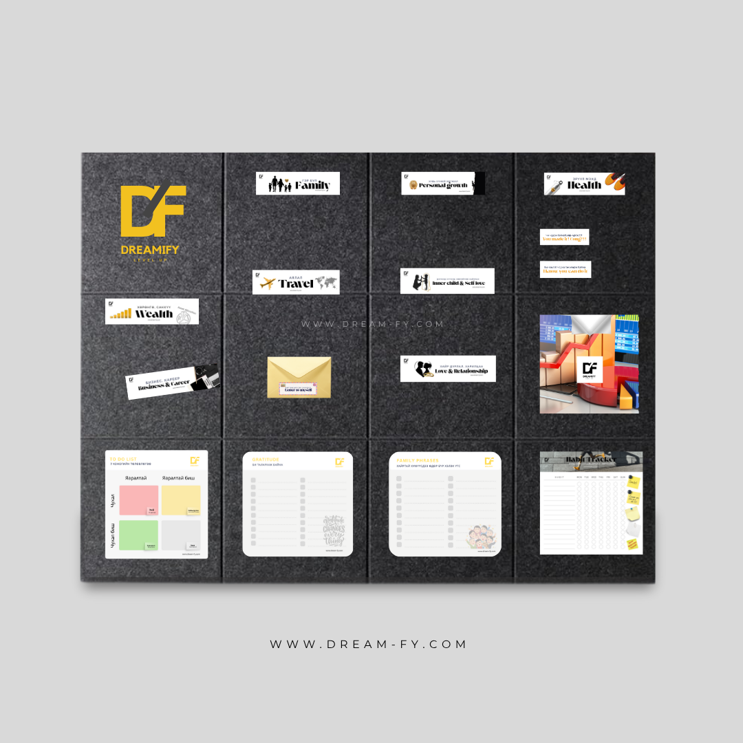 Өрөөний нэг ханаа хүсэл мөрөөдөлдөө хүрэх талбар болгож өөрчлөөрэй. Харах бүрд сэтгэл сэргэж, урам зориг бадарч, зорилго тодорч, амьдралын утга учир, амтыг мэдрэхээр өөртөө болон дотно хүмүүстээ зориулсан орон зайг бүтээгээрэй.